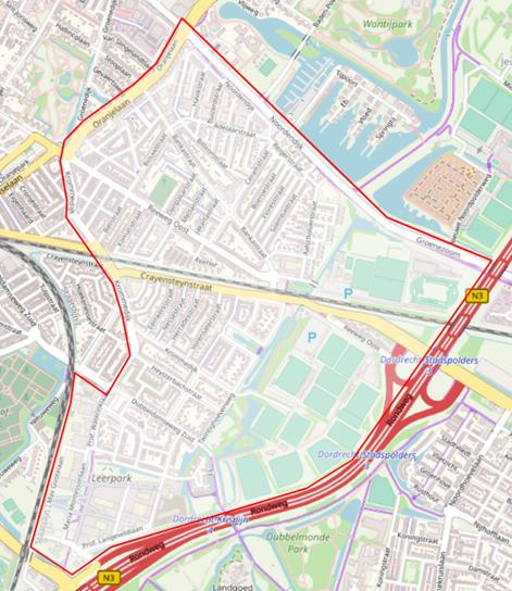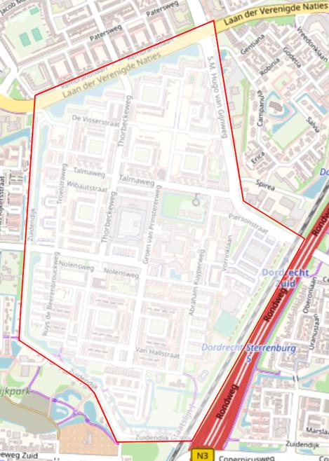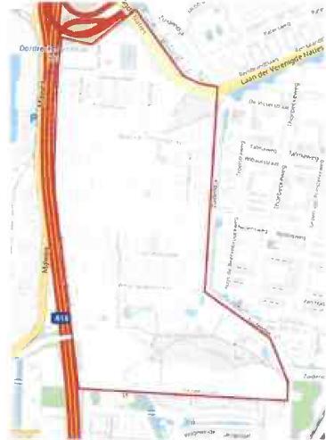 Het gebied binnen de wijk Wielwijk dat wordt begrensd door de straten: Laan der Verenigde Naties, Zuidendijk, Reeweg Zuid, Laan van Londen, Admiraal de Ruyterweg tot de afrit van de rijksweg A16 (afrit zelf niet) naar de Laan der Verenigde Naties, de genoemde wegen, oevers en aanwezige knooppunten van openbaar vervoer daarbij inbegrepen.
