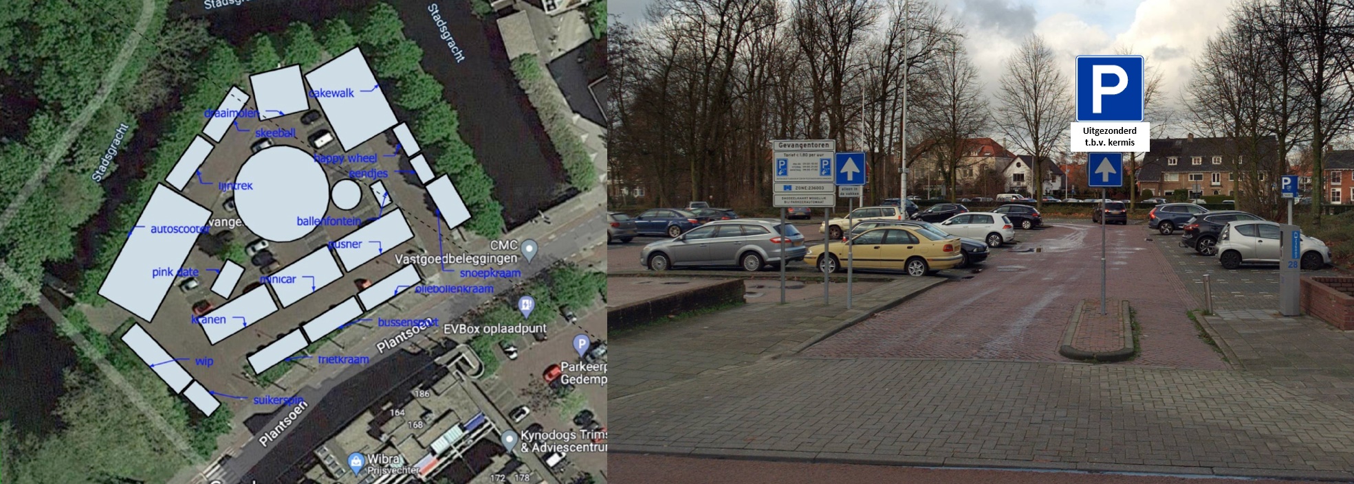 In de afbeelding hierboven is links aangegeven waar de verschillende attracties van de kermis komen te staan en rechts de toegang tot parkeerterrein Gevangentoren waarbij het verkeersbord en onderbord is geplaatst. Dit alles geeft aan dat het parkeerterrein Gevangentoren tijdens de kermis vrij van auto's moet zijn.